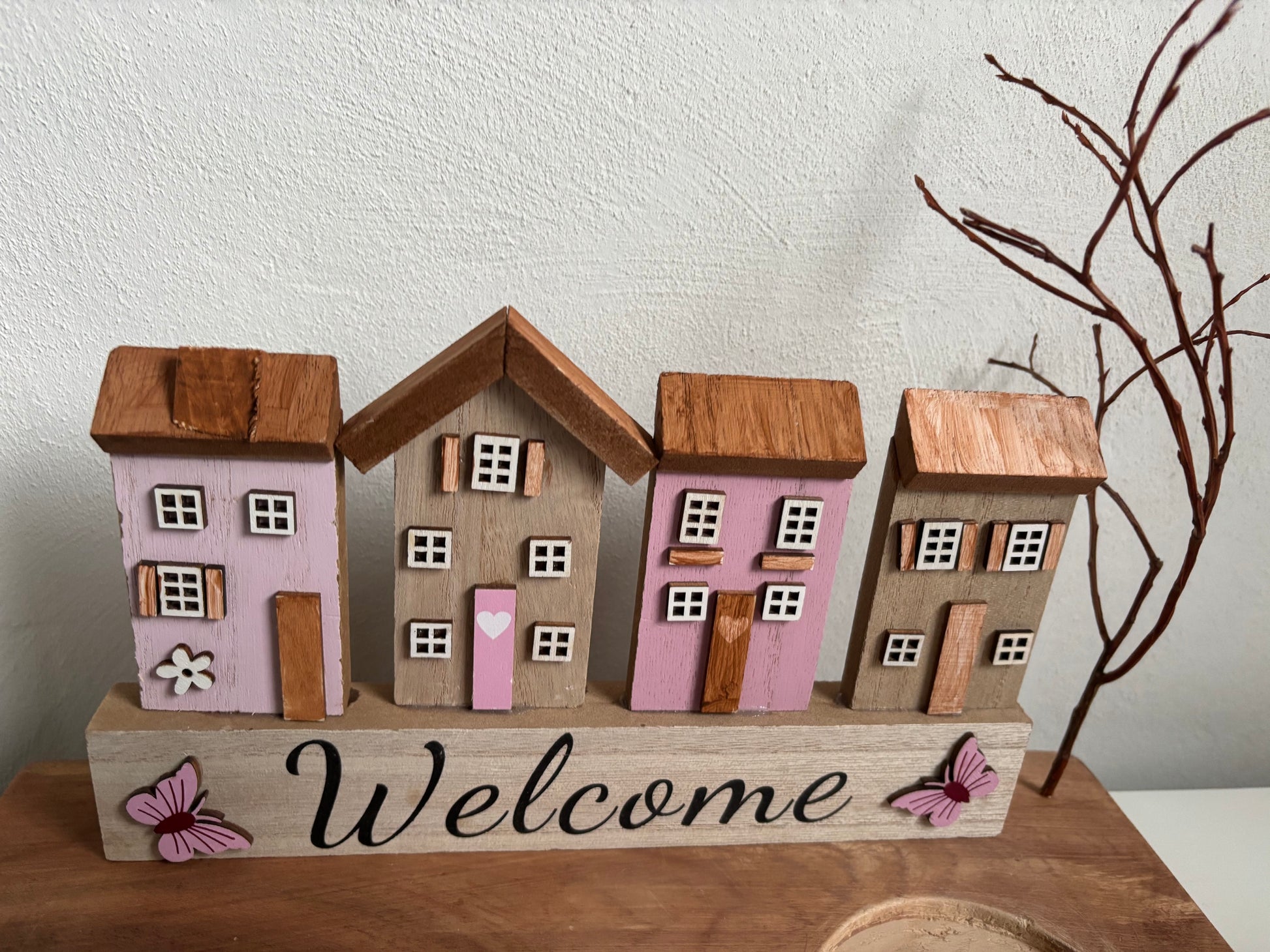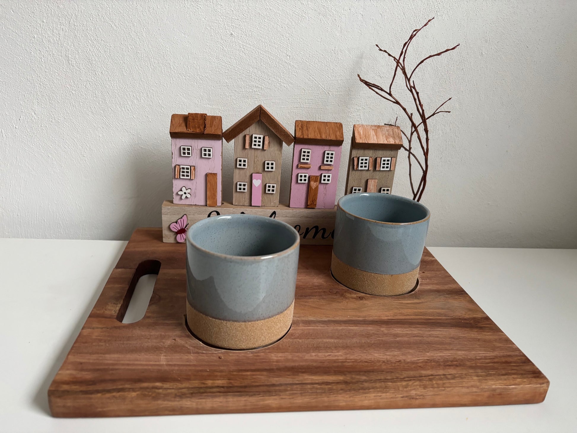 Holzbrett mit Keramiktöpfchen und einer Häuserzeile mit der Aufschrift "Welcome". In die Keramiktöpfchen können Snacks gereicht werden.