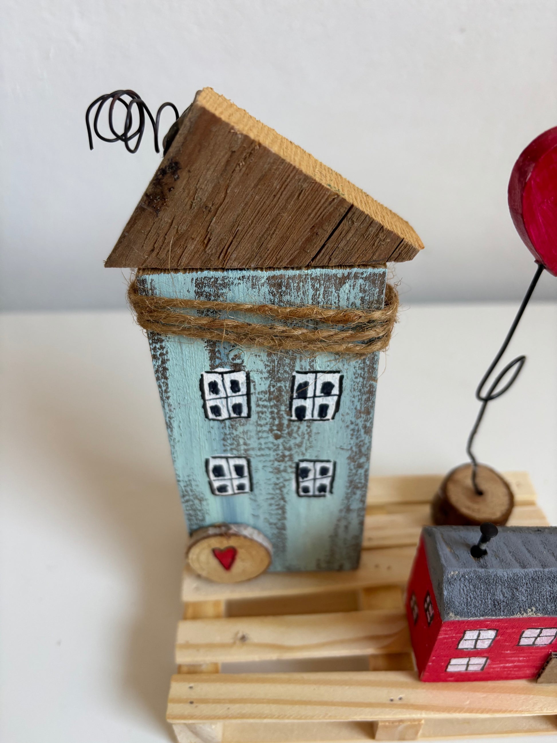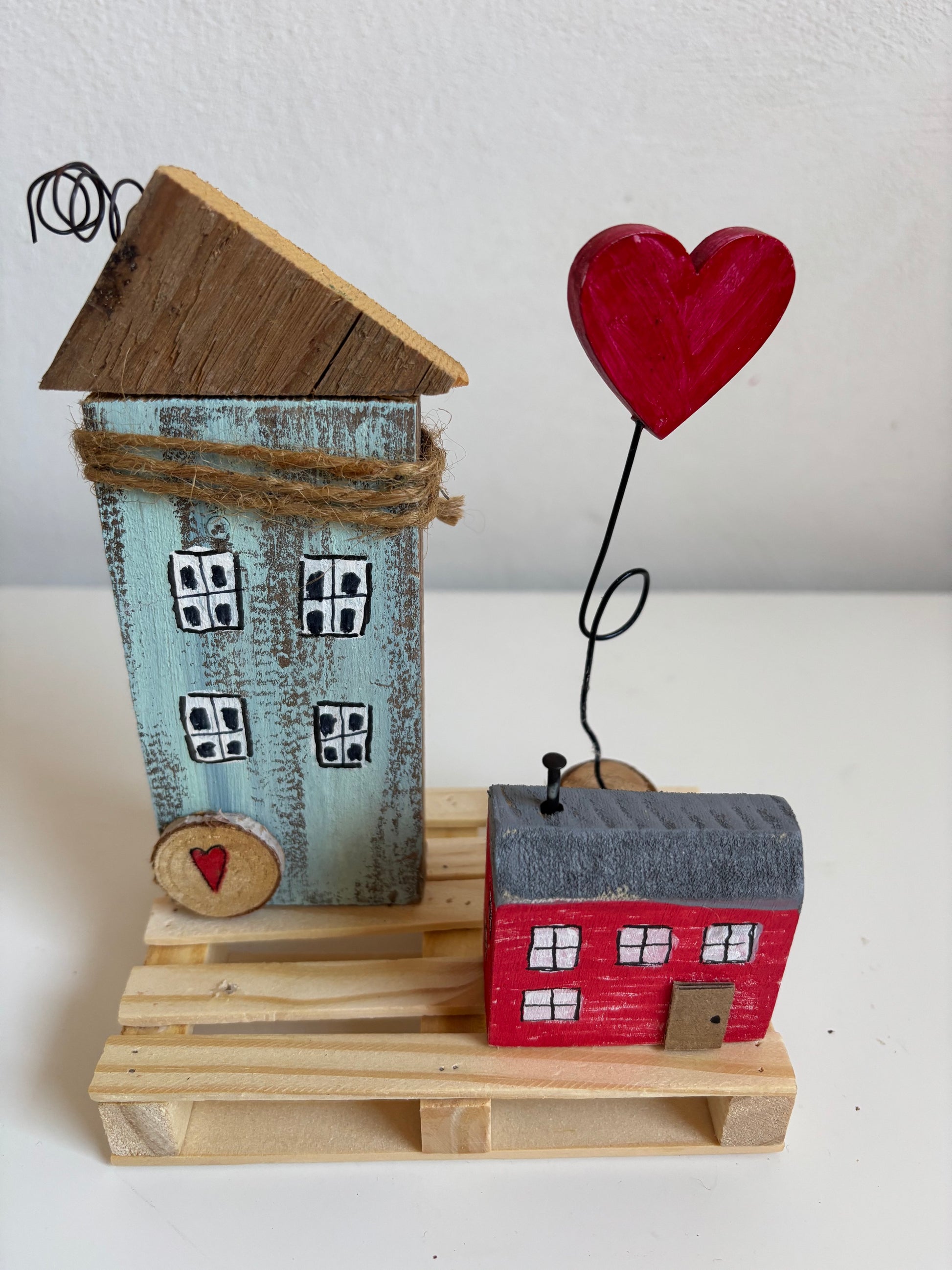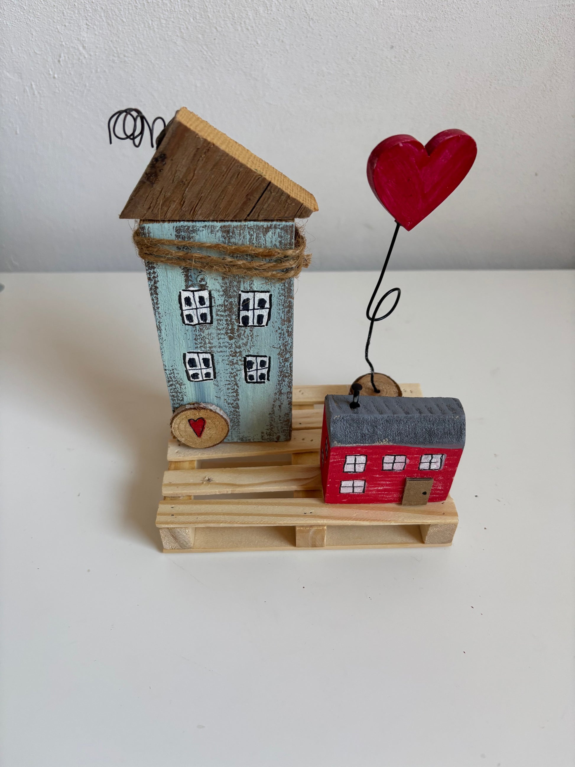 Zwei unterschiedliche Holzhäuser auf einer kleinen Holzpalette. Zusätzlich als Detail ein rotes Herz auf einem Draht. Beide Häuser sind mit liebevollen Details versehen und aus altem Holz hergestellt. Sie eignen sich als kleines Mitbringsel oder Hingucker im Eingangs- und Wohnbereich.